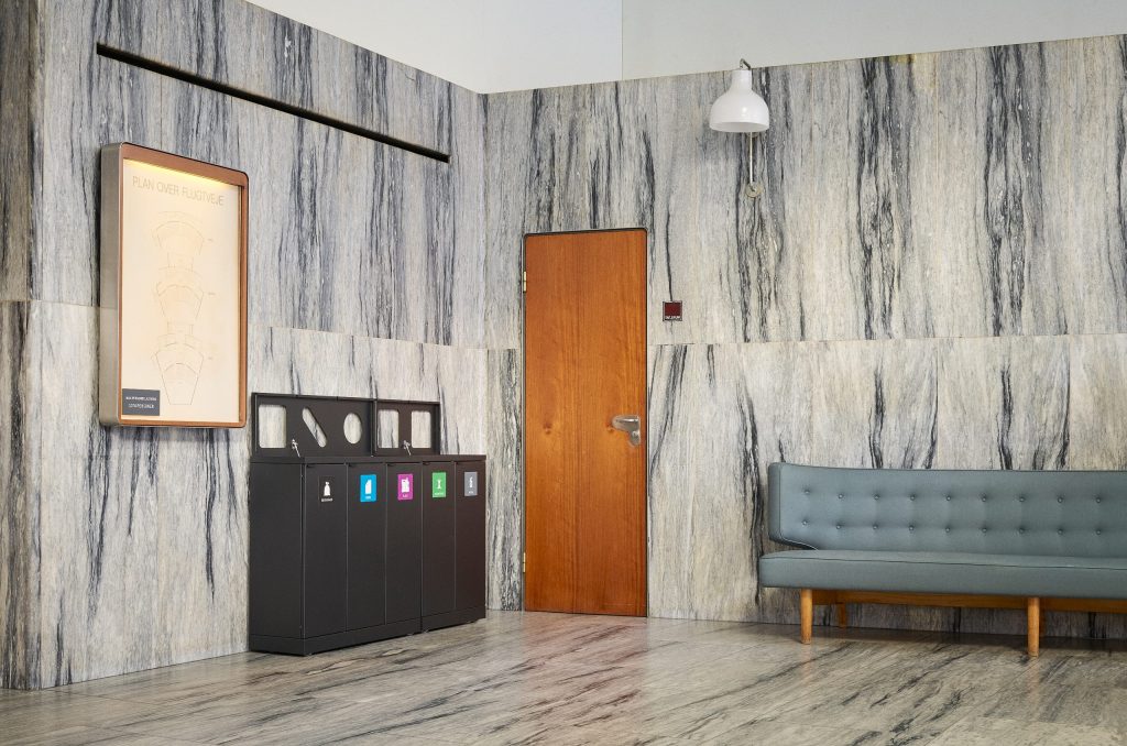 I korridorerna monterades avfallssystemen med beslag på väggen för att undvika,