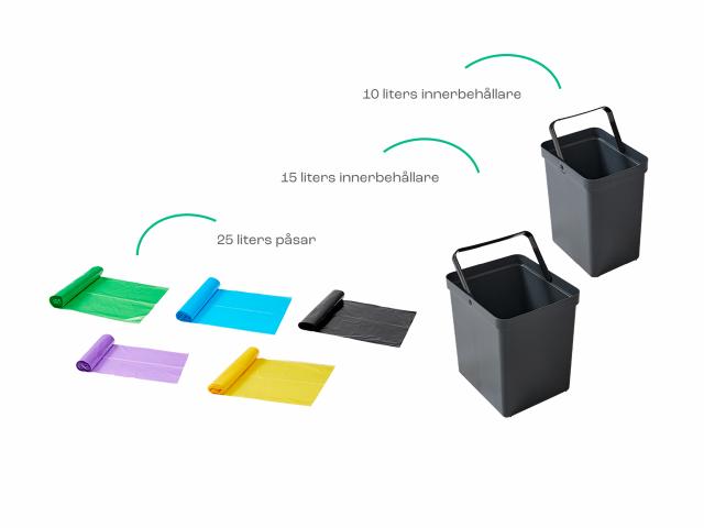 För innerbehållare med en kapacitet på 10 och 15 liter måste du använda påsar på 25 liter.