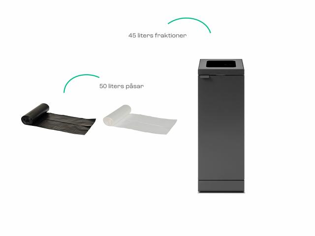 För alla fraktioner med en kapacitet på 45 liter måste du använda 50 liters påsar.