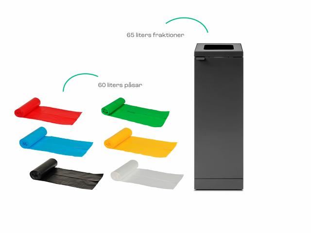 För alla fraktioner med en kapacitet på 65 liter måste du använda 60 liters påsar.