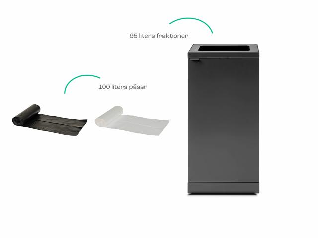 För alla fraktioner med en kapacitet på 95 liter måste du använda 100 liters påsar.